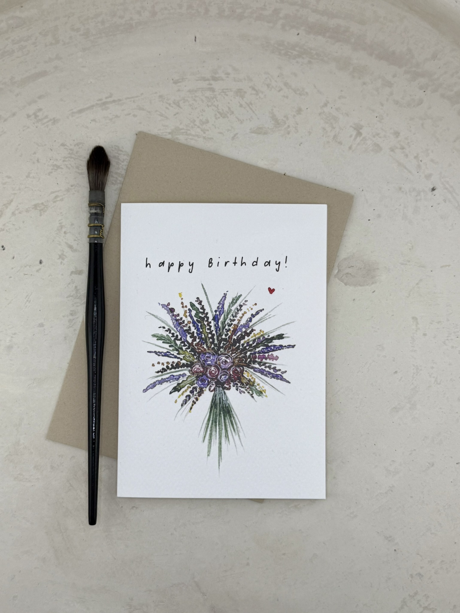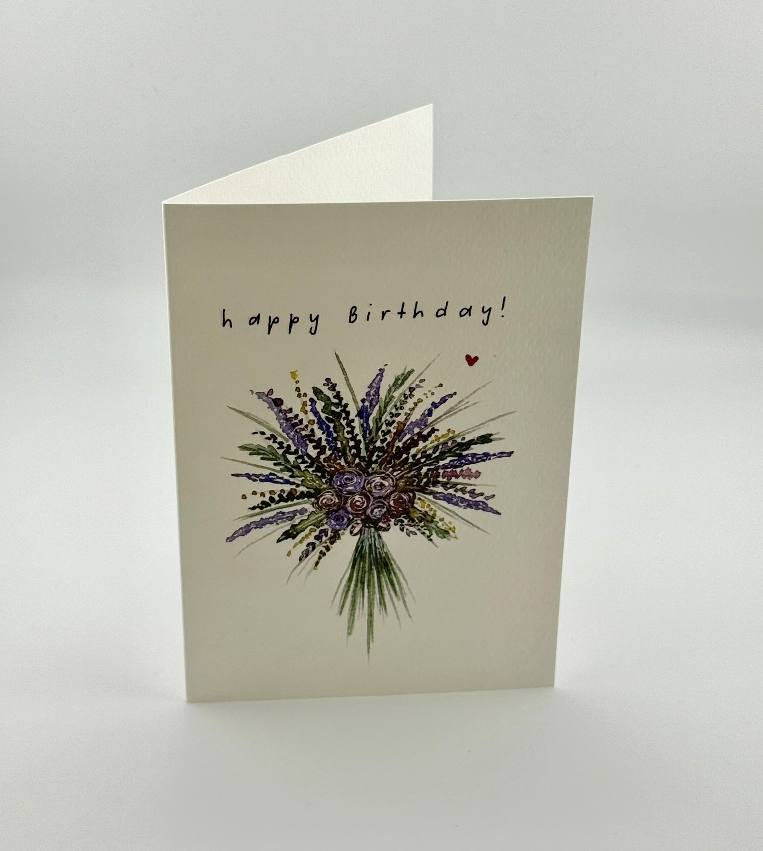 Diese elegante Geburtstagskarte zeigt einen farbenfrohen, handgezeichneten Blumenstrauss im Zentrum – mit Lavendel, Rosen und verschiedenen grünen Zweigen. Über dem Strauss steht der handschriftliche Gruss „happy Birthday!“ und ein kleines rotes Herz rundet das Motiv liebevoll ab. Die Karte strahlt Frische, Lebensfreude und Natürlichkeit aus.