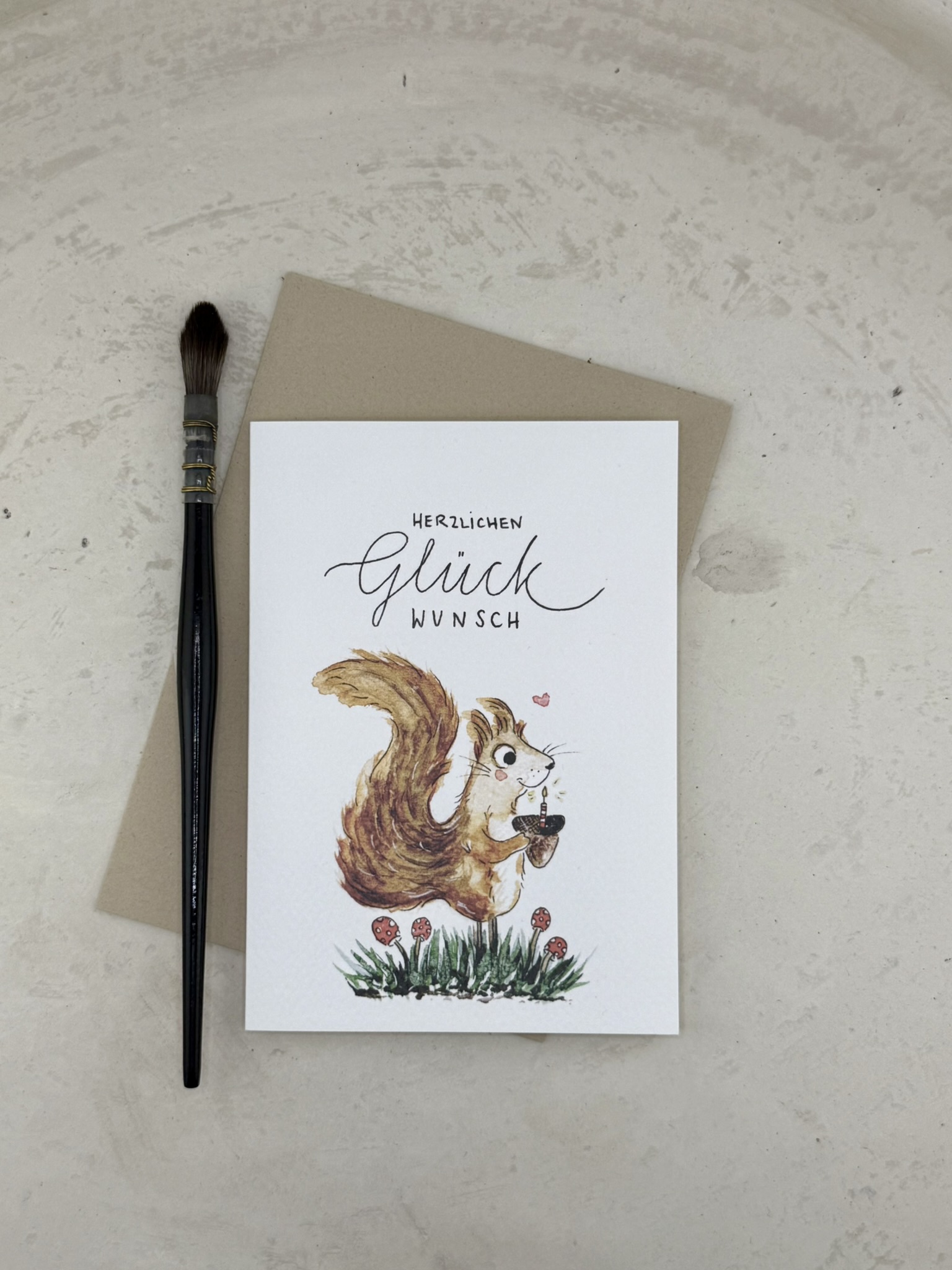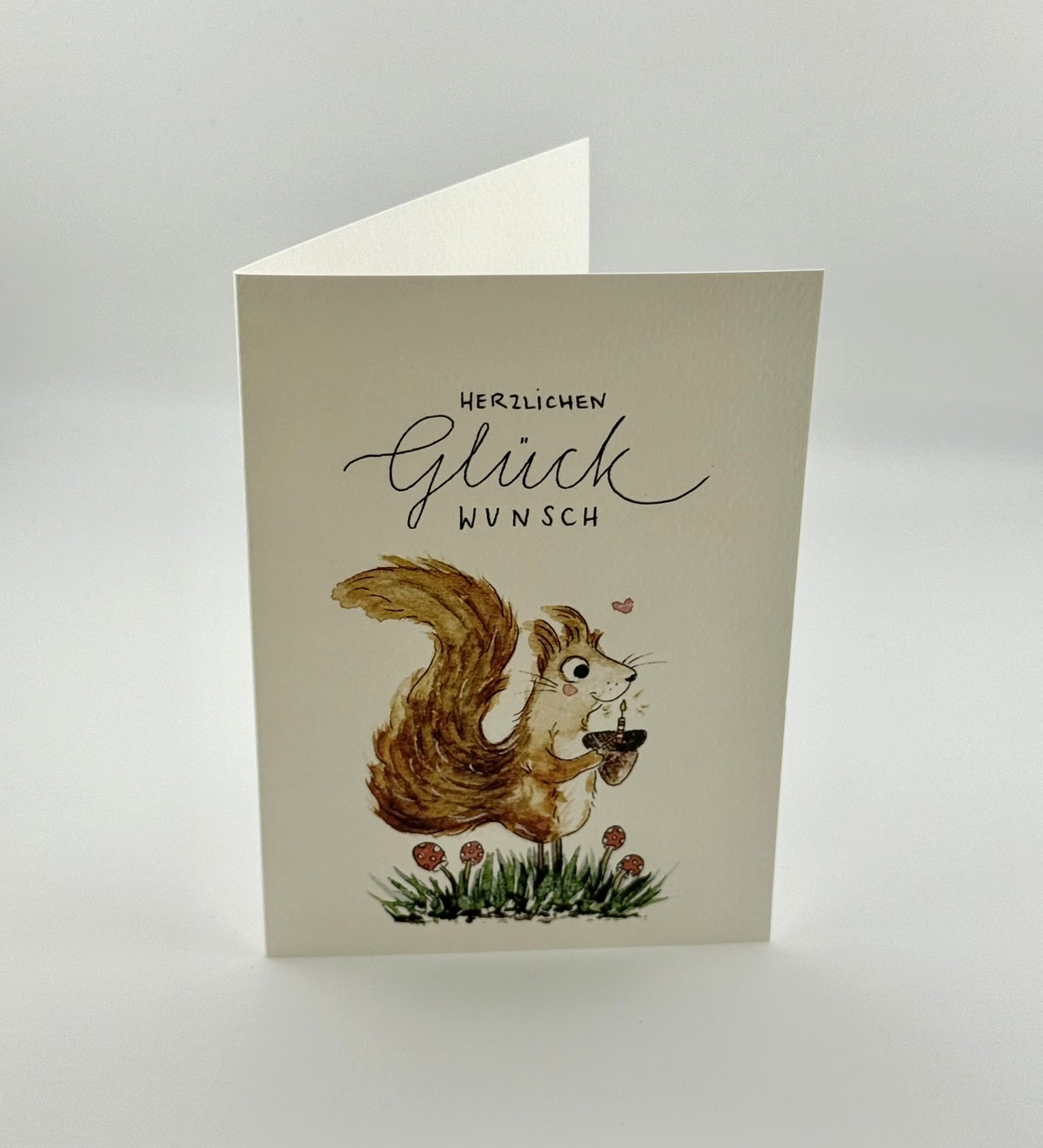 Diese freundliche Glückwunschkarte zeigt ein quirliges Eichhörnchen auf einer Wiese, umgeben von kleinen Pilzen und einem Herzchen in der Luft. Das Eichhörnchen hält freudig eine braune Eichel in den Pfoten. Darüber steht der handschriftliche Gruss „Herzlichen Glückwunsch“. Das Motiv strahlt Lebensfreude, Verspieltheit und natürlichen Charme aus.