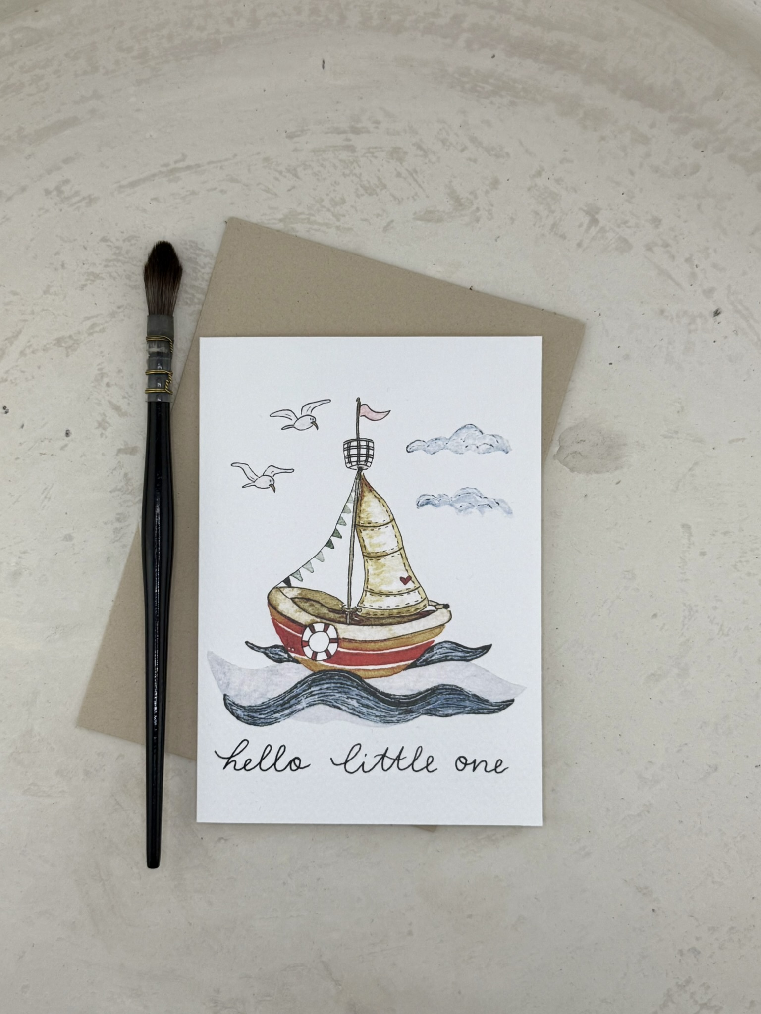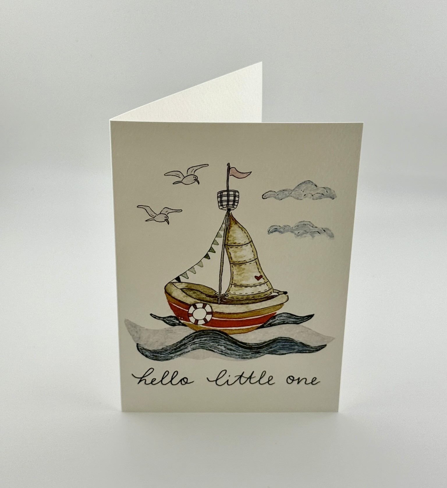 Diese liebevolle Karte zur Geburt begrüsst ein Baby mit einem kleinen, verspielten Segelboot, das auf sanften Wellen dahin fährt. Das Boot ist mit einer Wimpelkette und Rettungsring geschmückt; über ihm fliegen freundliche Möwen und am Himmel ziehen kleine Wolken vorbei. Darunter steht der handschriftliche Text „hello little one“. Das Motiv vermittelt eine ruhige, fröhliche Stimmung und symbolisiert die Reise des Lebens, die gerade erst beginnt.